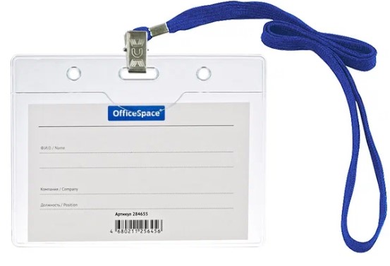 —Бейдж горизонтальный, 'OfficeSpace', 100x75 мм, с клипом на синем шнурке, 284655