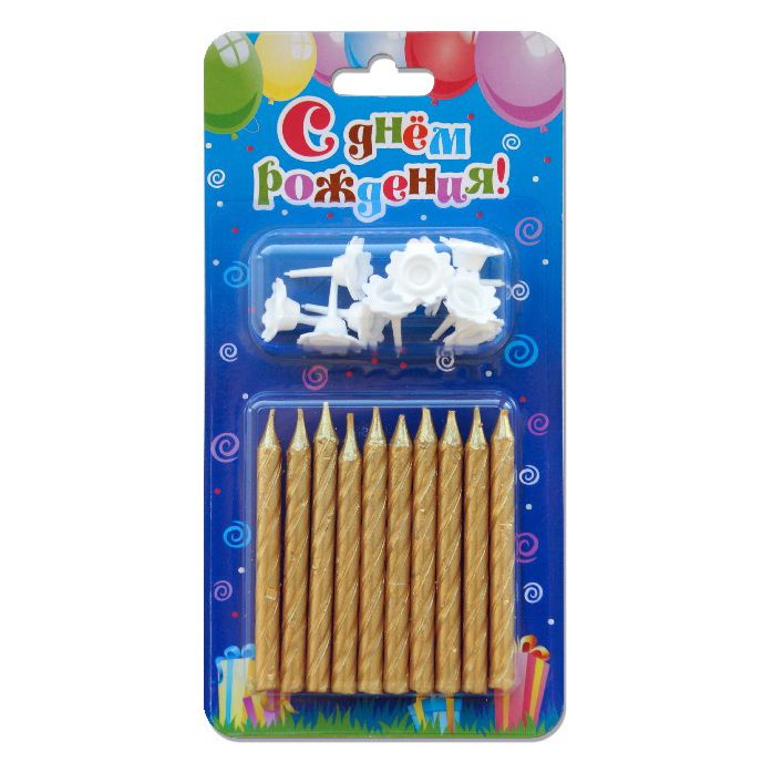 —Свечи для торта с подставками 'Золотые', спираль, (10 шт;уп), 0107